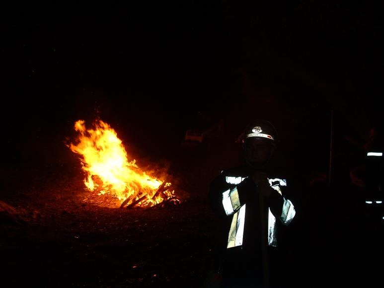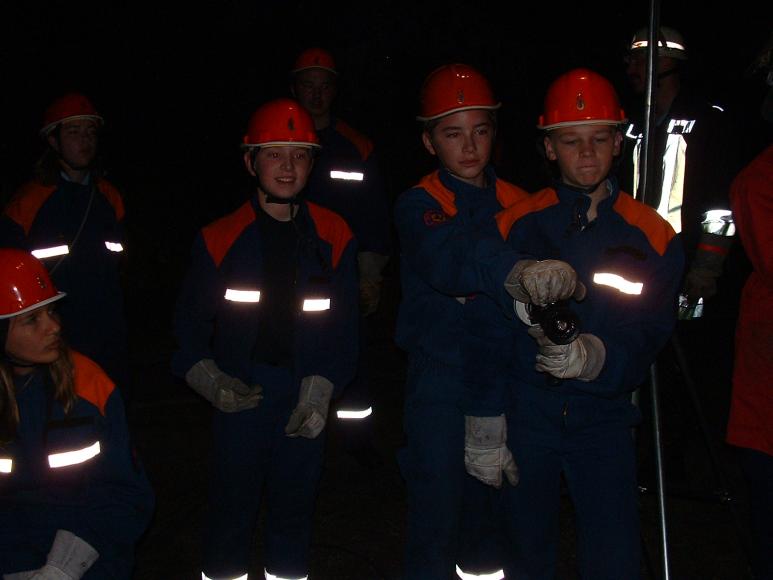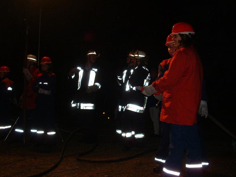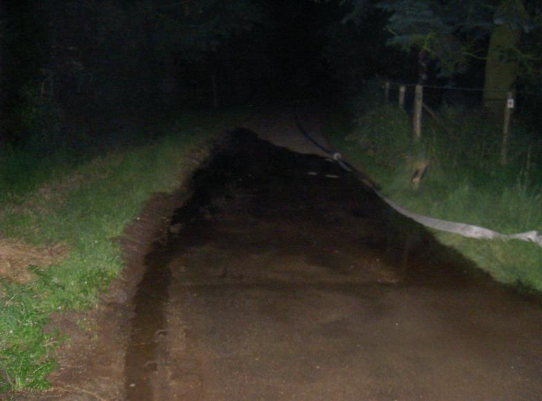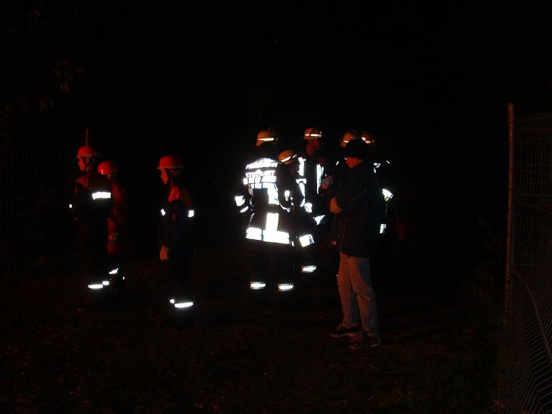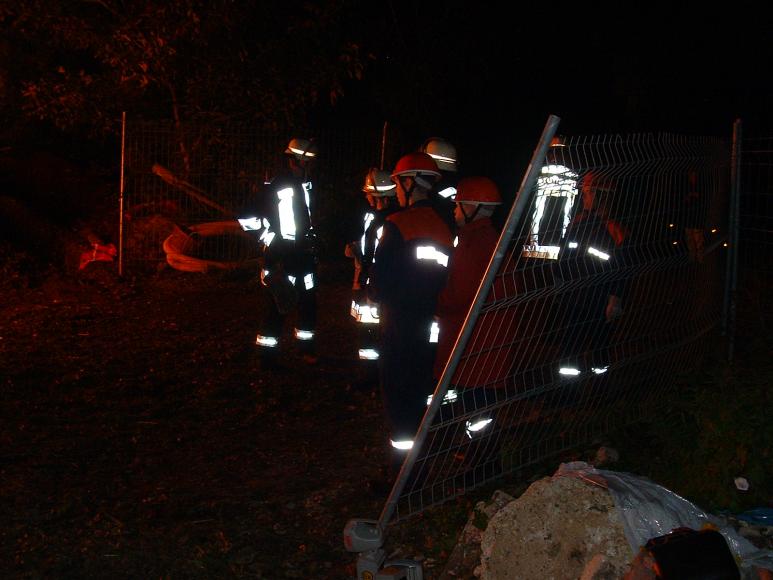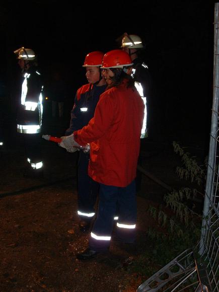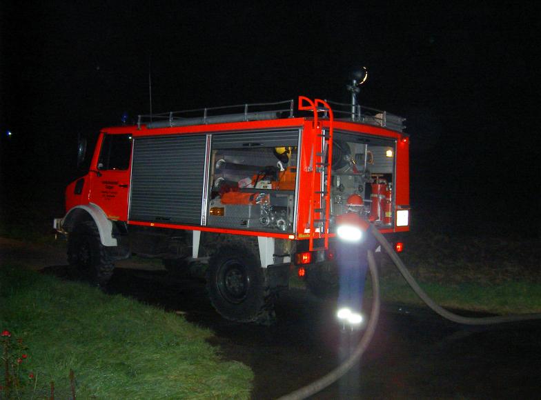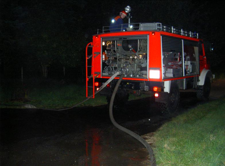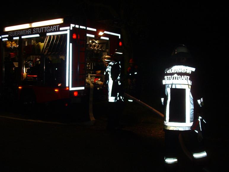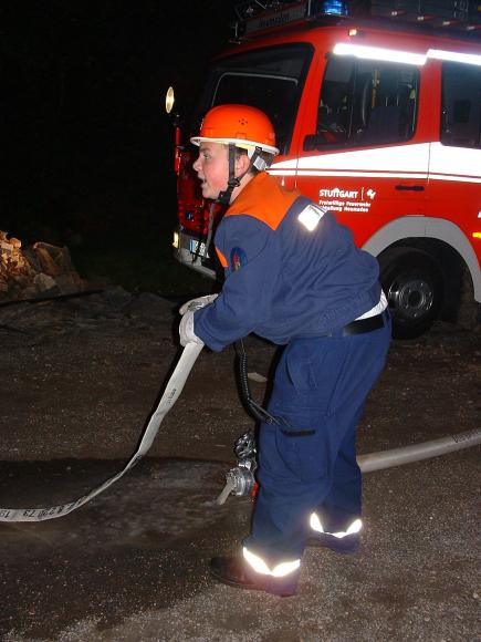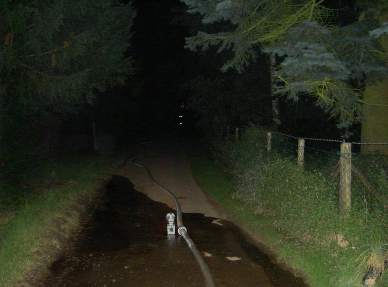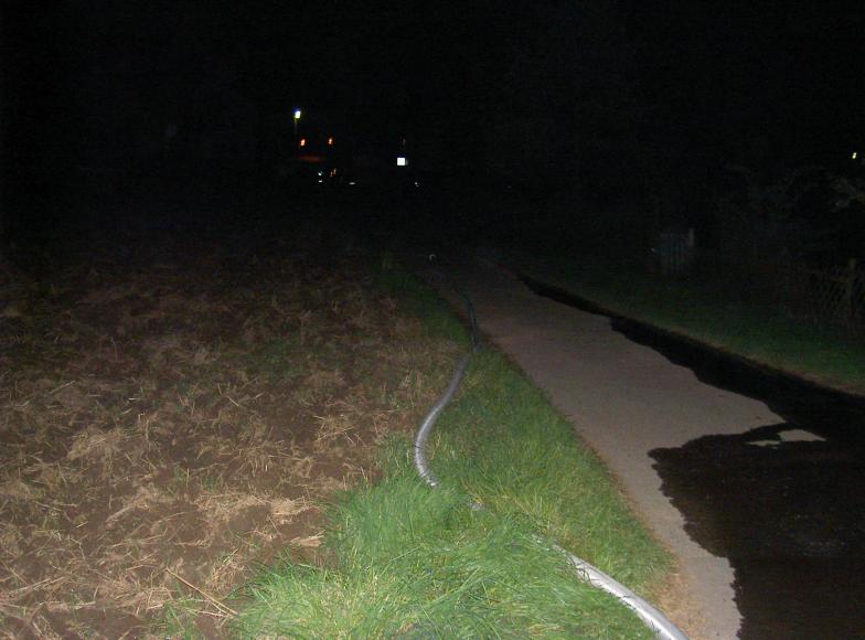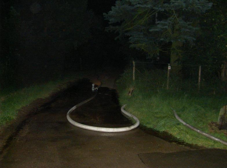 Doch morgens um 5:00 Uhr war die Nacht zuende. Ein Anwohner meldet Feuerschein in den Gärten am Gairenweg. Ein Gartenhaus am Ende des Gairenweges brennt in voller Ausdehnung. Das Wasser der Fahrzeuge reicht nicht aus. Es muß eine Wasserversorgung von der Nellingerstraße bis zum Lagerplatz der Fa. Gohl aufgebaut werden. Alle Achtung, um diese Uhrzeit.
