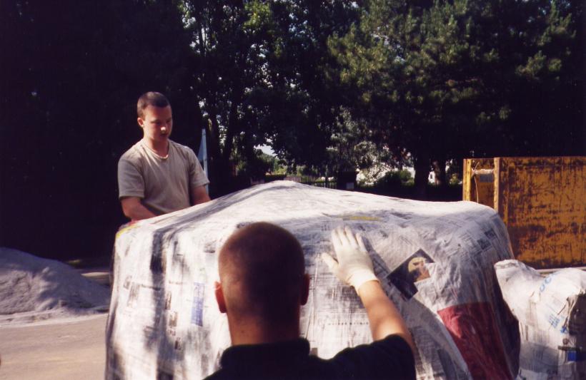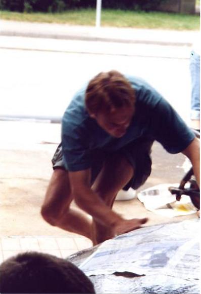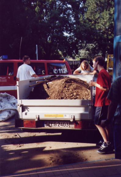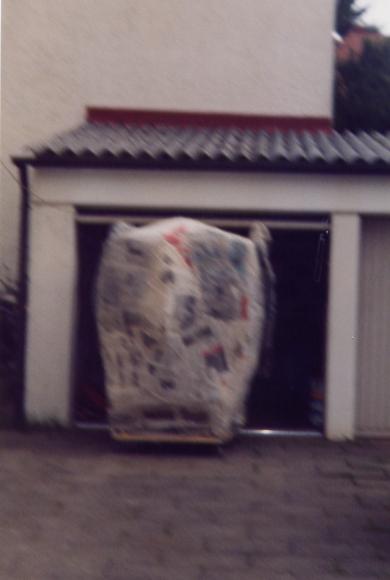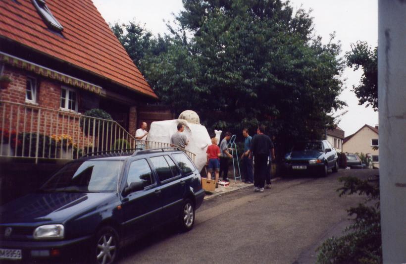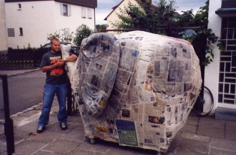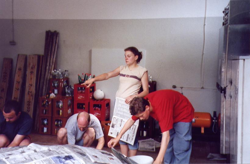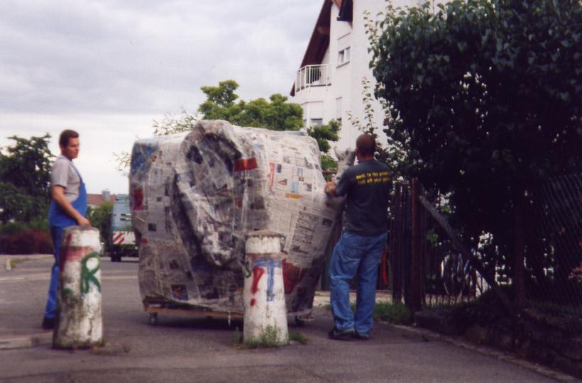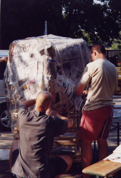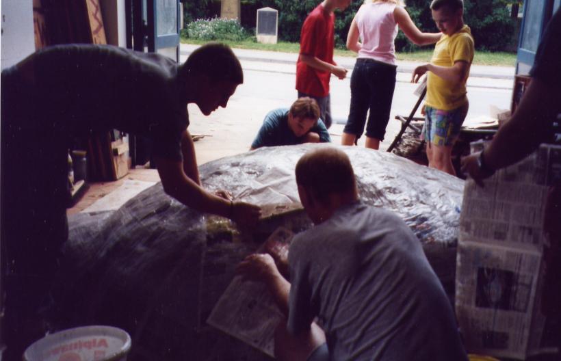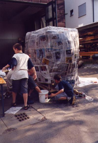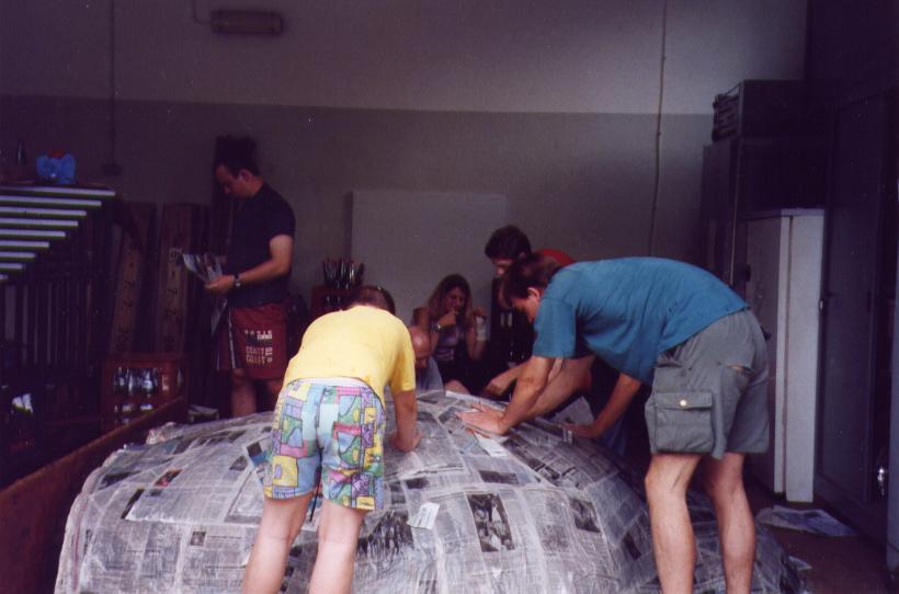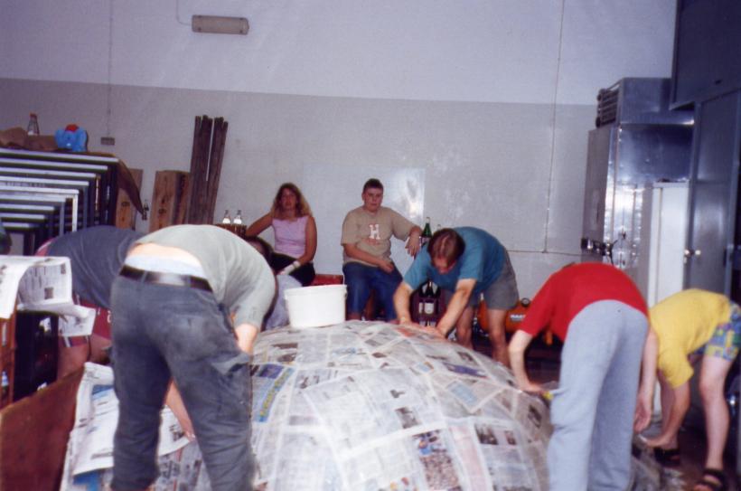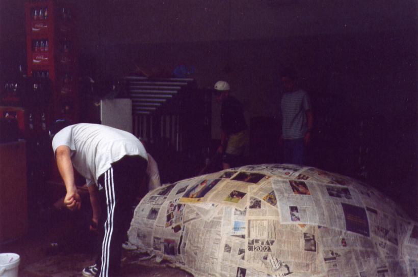 Nachdem wir ein Modell gebaut hatten waren wir der Meinung es müßte am einfachsten sein 2 Halbformen aus Erde herzustellen und diese dann dick (selbsttragend) mit Zeitungen einzukleistern. Wir ließen also 1 Kubikmeter Erde anliefern, und formten daraus die erste Halbform und beklebten sie mit ca. 2 cm Zeitungspapier.