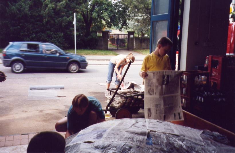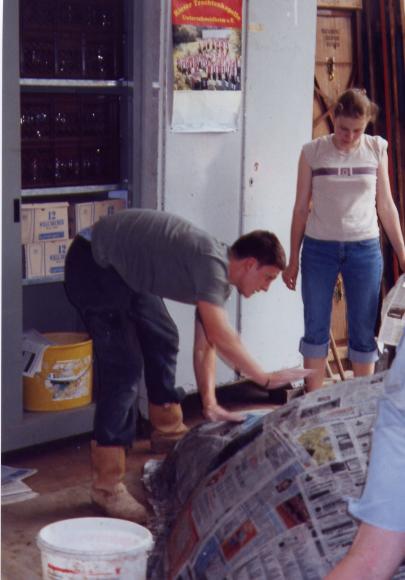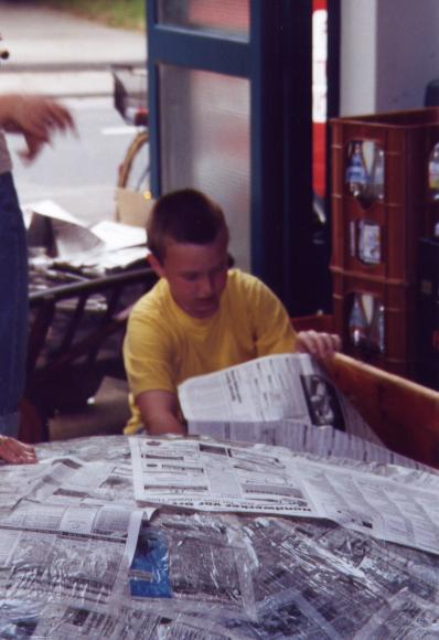 Nun mußte das ganze nur noch mit Zeitungen bedeckt werden. Leider klebt Tapetenkleister nicht so gut am Drahtgitter.