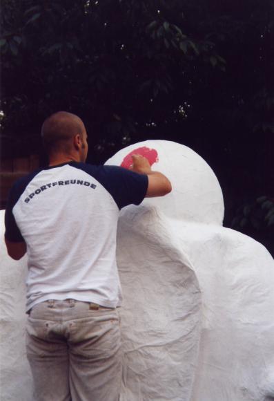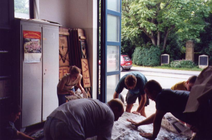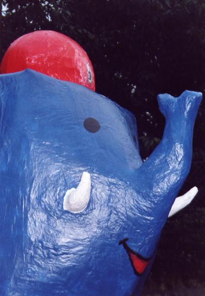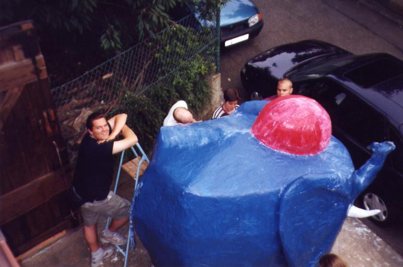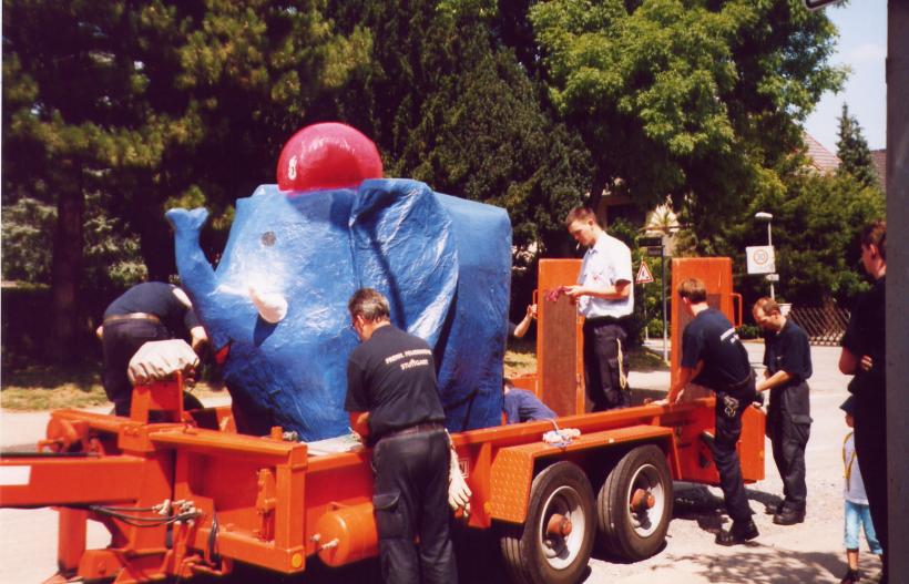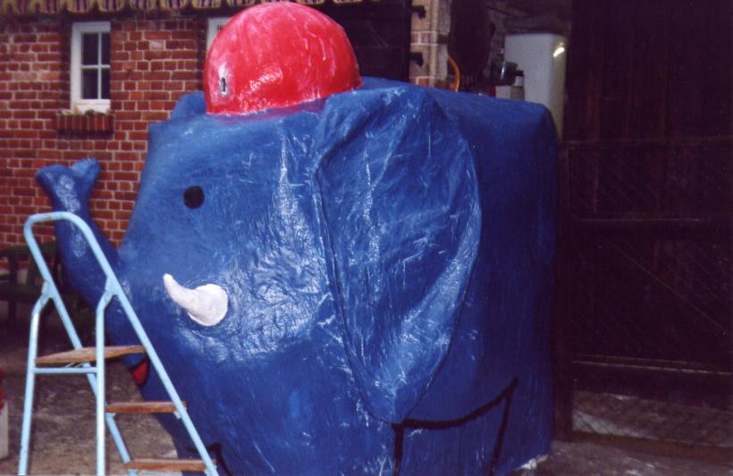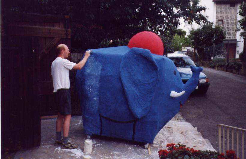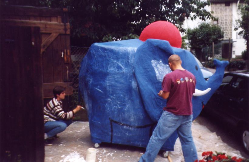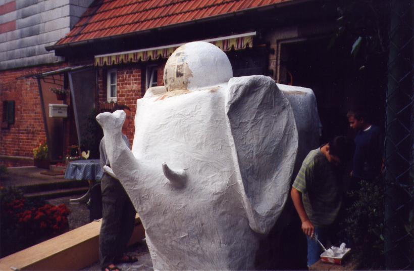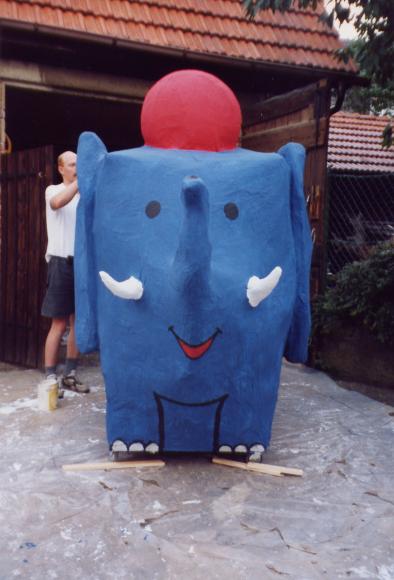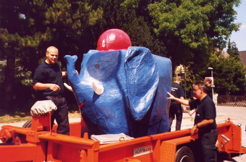 Um den Elefanten aber finden zu können, mußte er zuerst einmal existieren. Hier einige Bilder von der Entstehung des netten, kleinen, blauen Dickhäuters im Feuerwehrhaus der FF-Heumaden.
