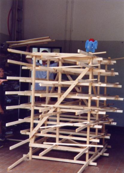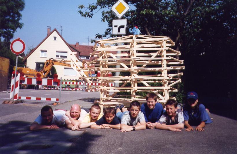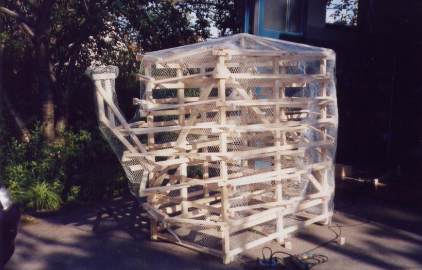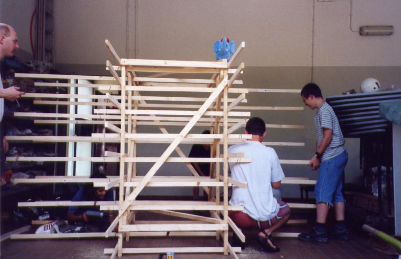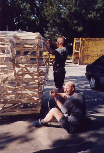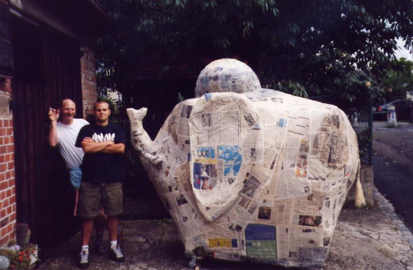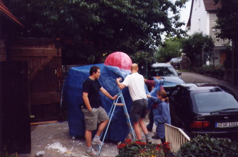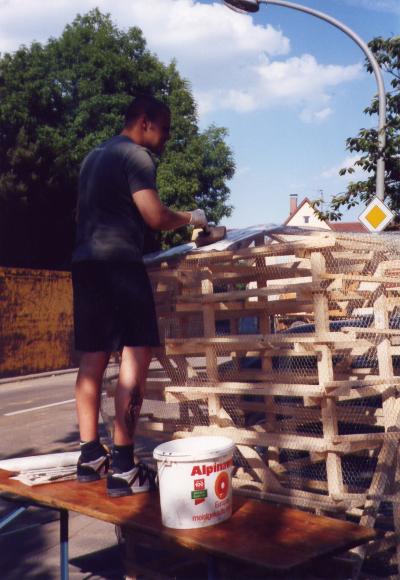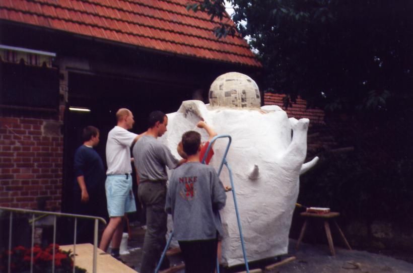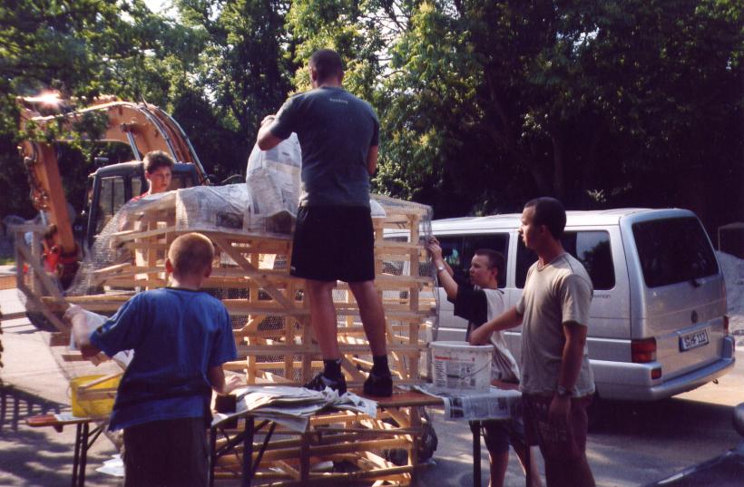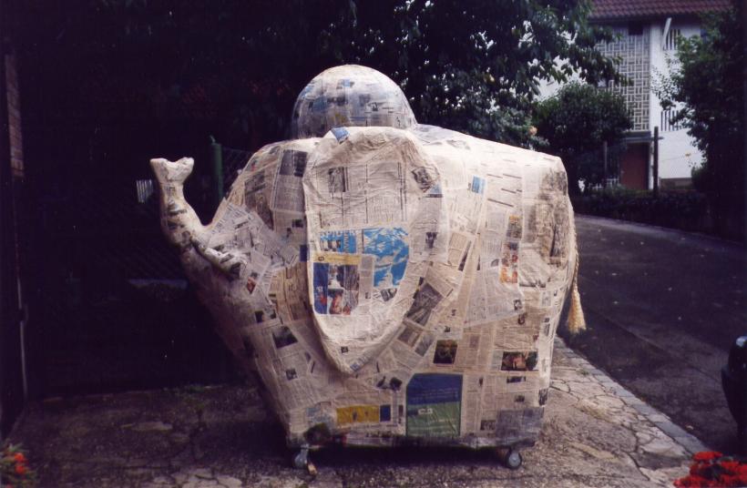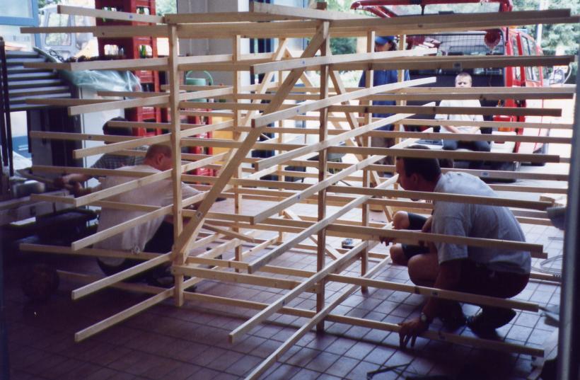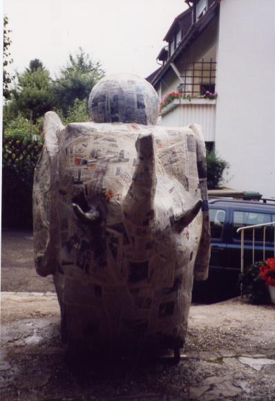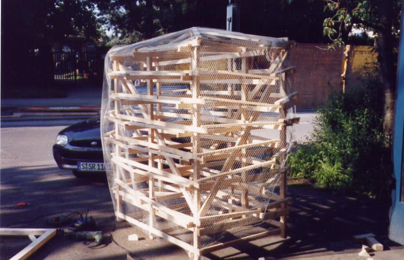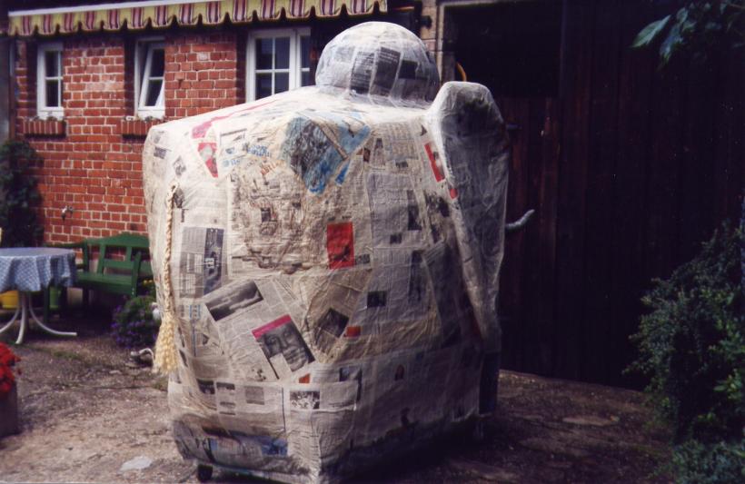 Leider trocknete die dicke Schicht Zeitungen nicht schnell genug aus, um rechtzeitig selbsttragend zu sein. So mußte kurzfristig umgeplant werden. Die Erde wieder raus, und aus Latten ein Gerüst gezimmert. Hierbei stellte sich das Problem: 'Wie baut man aus geraden Dachlatten einen runden Elefant?'