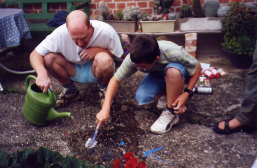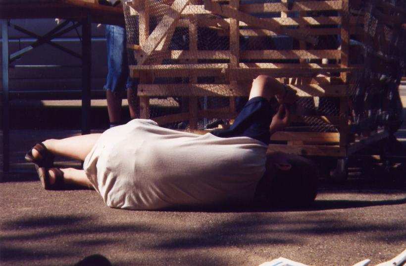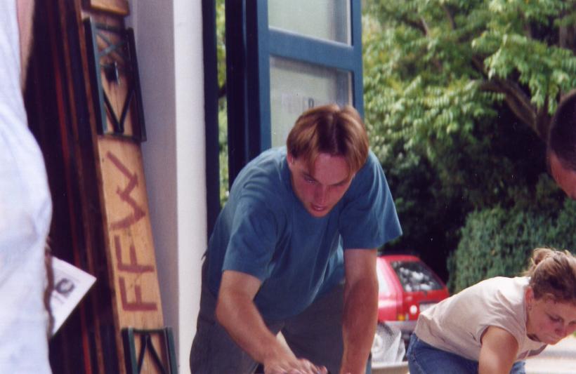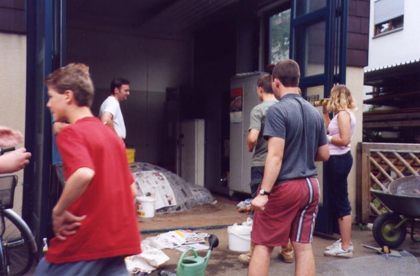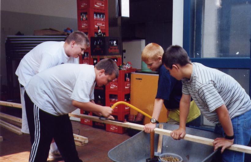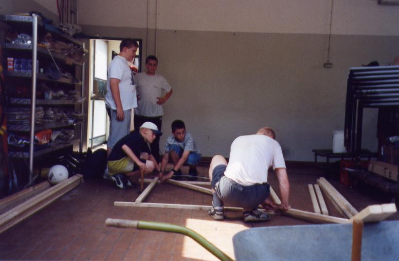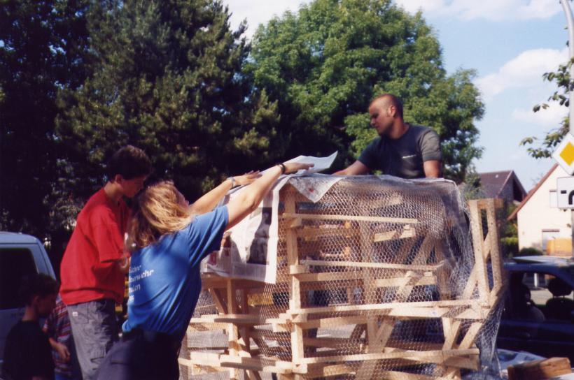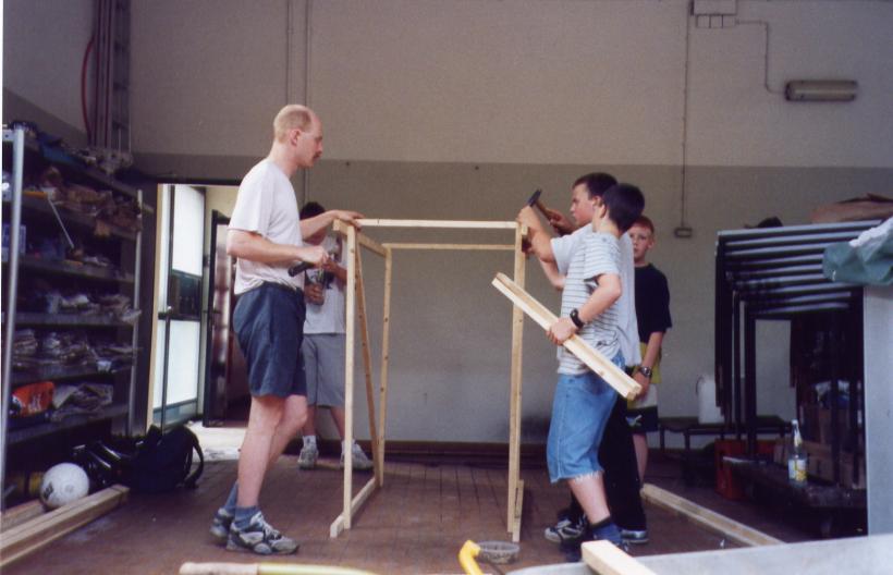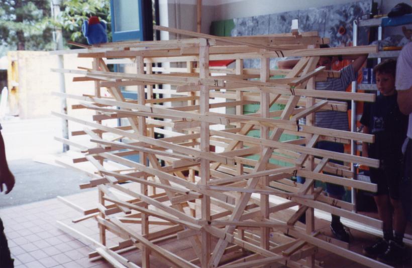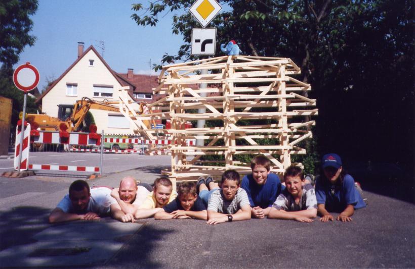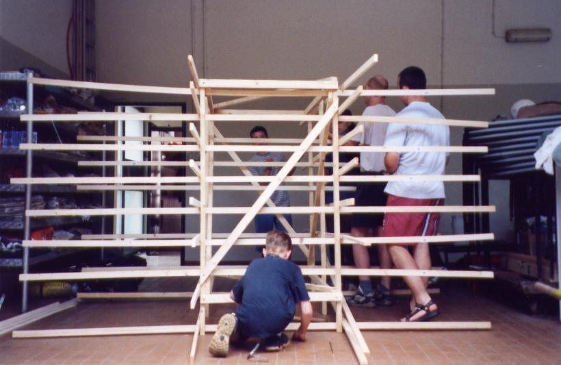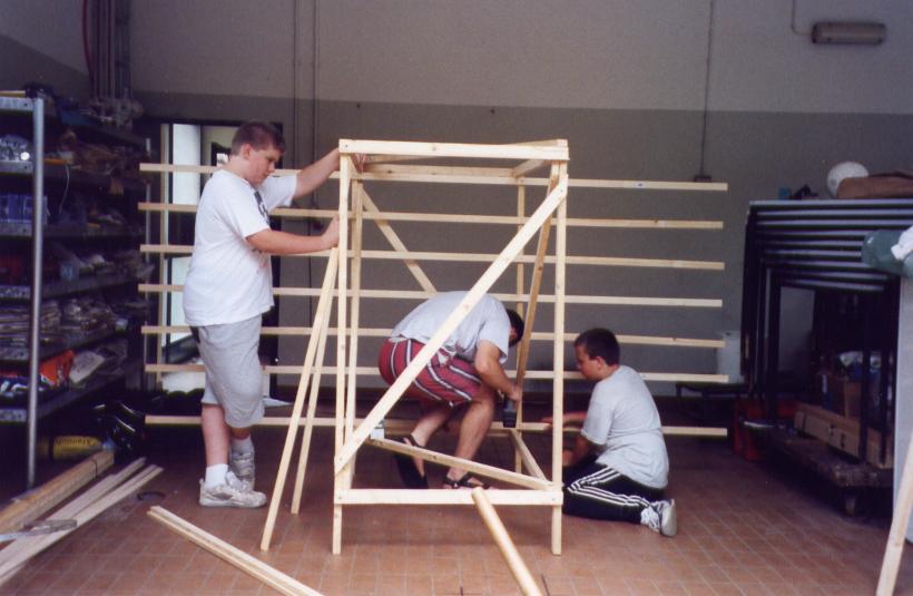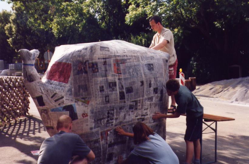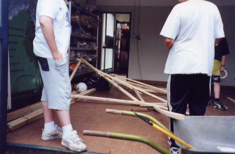 Leider trocknete die dicke Schicht Zeitungen nicht schnell genug aus, um rechtzeitig selbsttragend zu sein. So mußte kurzfristig umgeplant werden. Die Erde wieder raus, und aus Latten ein Gerüst gezimmert. Hierbei stellte sich das Problem: 'Wie baut man aus geraden Dachlatten einen runden Elefant?'
