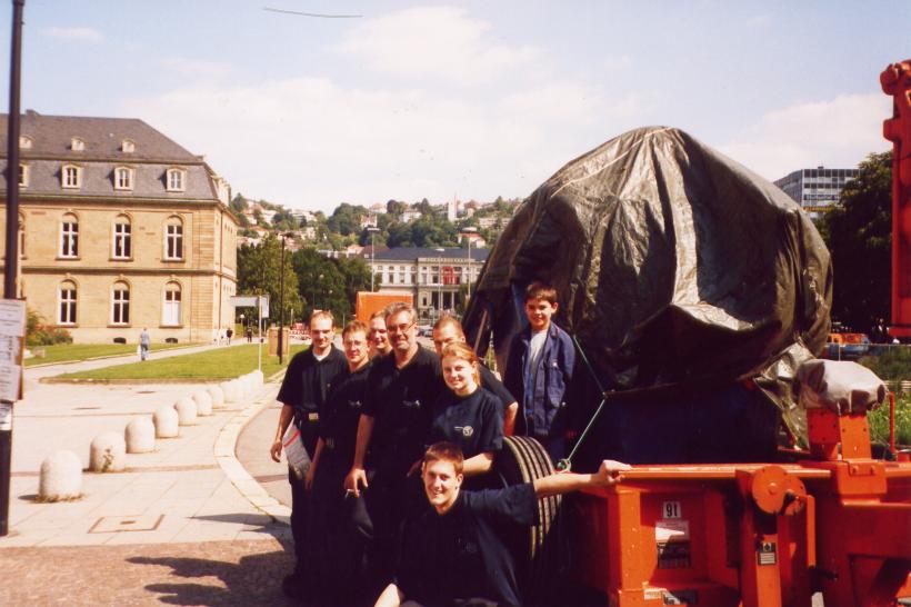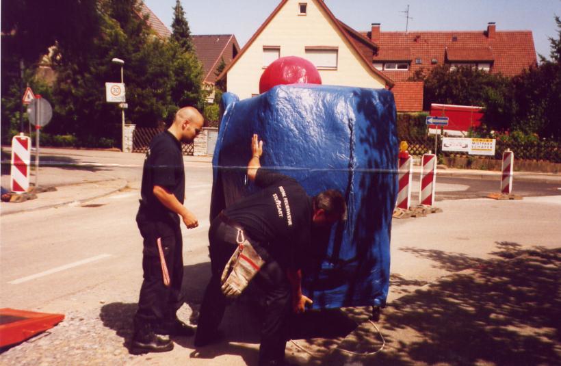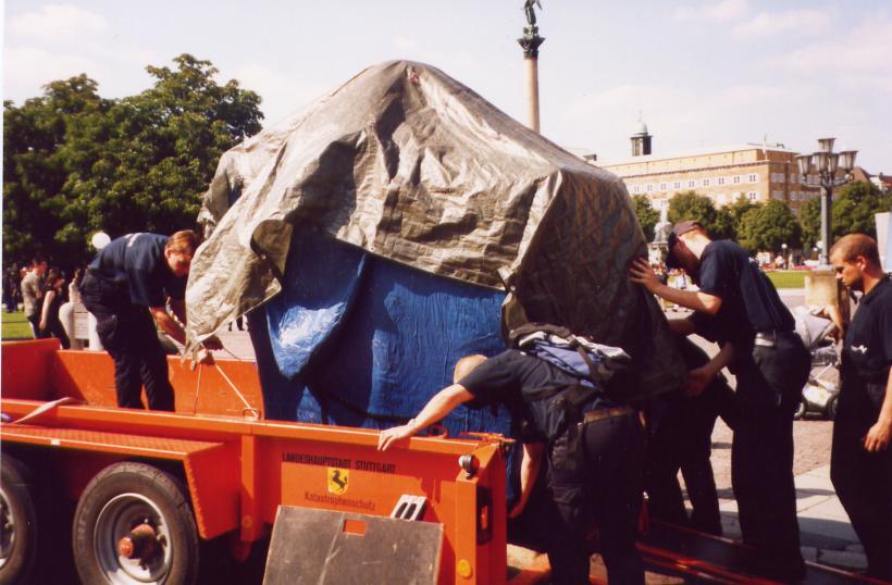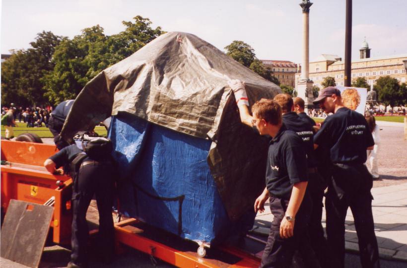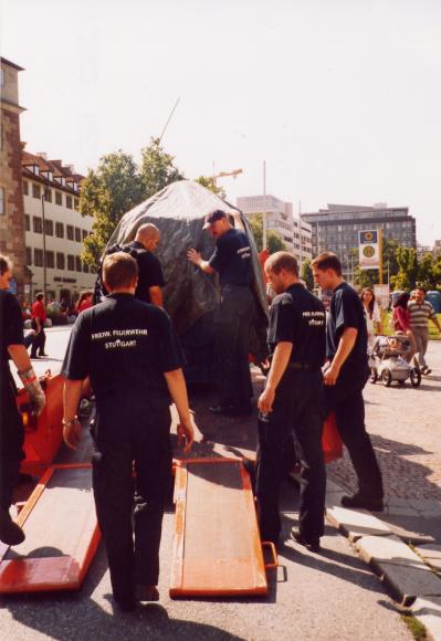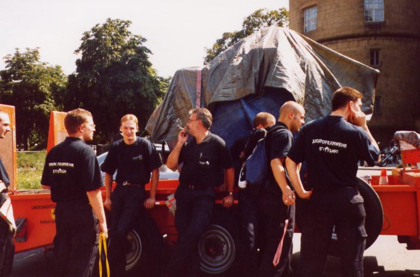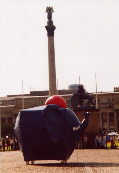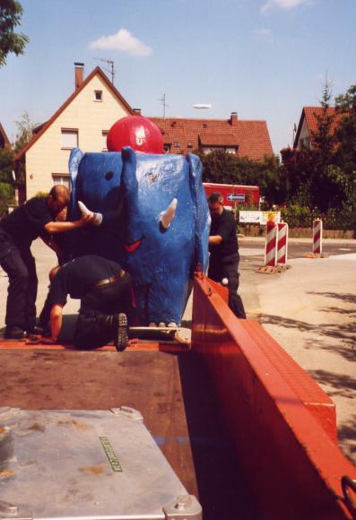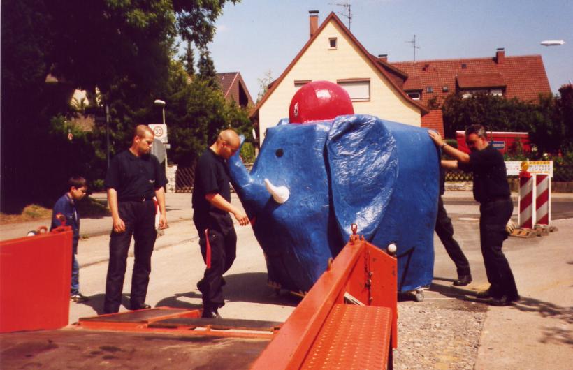 Gebaut wurde der Elefant im Feuerwehrgerätehaus in Heumaden. Sein Auftritt war auf dem Schoßplatz im Zentrum Stuttgarts geplant. Da der Elefant doch etwas größer war wurde er mit dem Feuerwehrtieflader abgeholt und mit MTF-Eskorte auf den Schloßplatz gefahren.